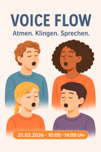 Deine Stimme begleitet dich immer – beim Sprechen, Singen und im (beruflichen, schulischen, privaten) Alltag. In Voice Flow verbinden wir Atem, Stimme und Rhythmus und entdecken, wie sich daraus mehr Ausdruck und Leichtigkeit entwickeln. Was sich dadurch in deiner Stimme verändert, erlebst du direkt im Tun.